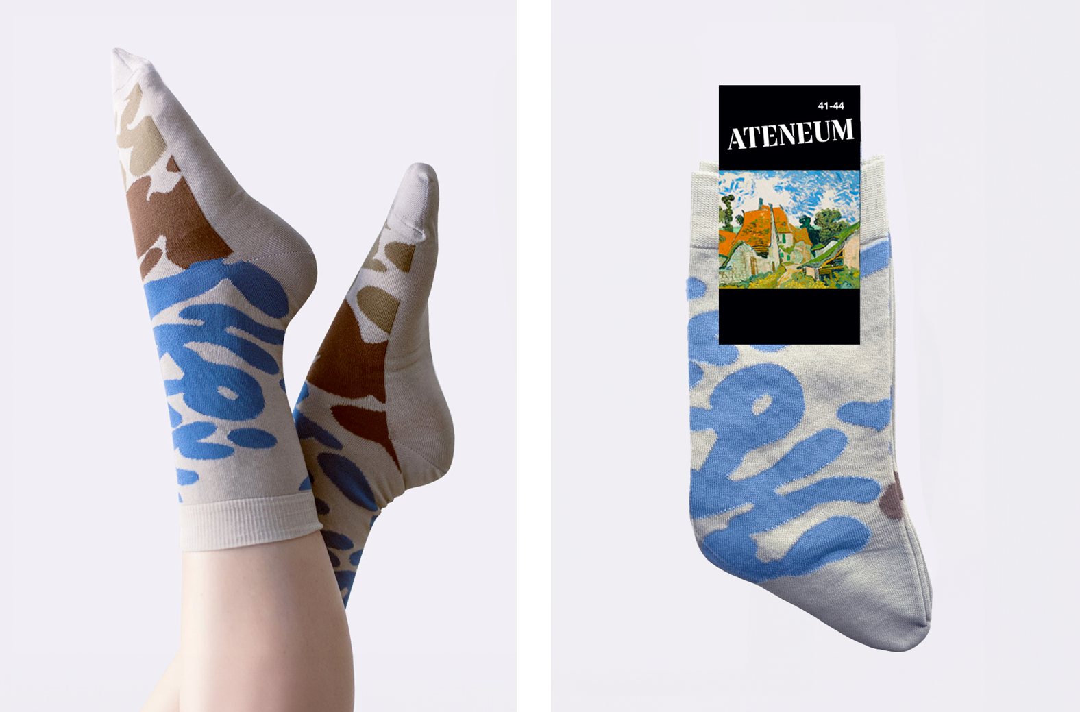 Suunnitteluvaihe alkoi tutkimalla Ateneumin taidekokoelmia, keskittyen erityisesti niihin teoksiin, jotka resonoivat eniten nykypäivän yleisölle ja jotka sopivat harmonisesti sukkaformaatille. Oli tärkeää löytää tasapaino taiteellisen ilmaisun ja käytännöllisyyden välillä, jotta sukat eivät ainoastaan olisi visuaalisesti miellyttäviä, vaan myös mukavia ja kestäviä käytössä. Sukkien designeihin valittiin erilaisia taide-elementtejä, jotka edustivat Ateneumin kokoelman moninaisuutta – mukaan lukien kansallisromantiikan klassikoita, modernismin mestariteoksia sekä nykyaikaista taidetta. Jokainen sukkapari suunniteltiin niin, että se kertoi oman tarinansa, välittäen taiteilijoiden visioita ja tunteita värikkäällä ja eläväisellä tavalla. Käytimme digitaalista painotekniikkaa varmistaaksemme, että jokainen yksityiskohta ja sävy toistuu tarkasti ja värit pysyvät eloisina pitkään.